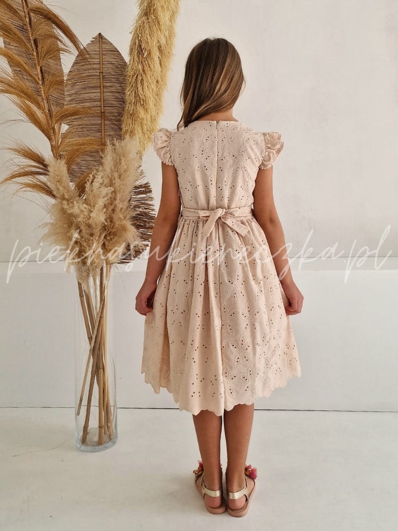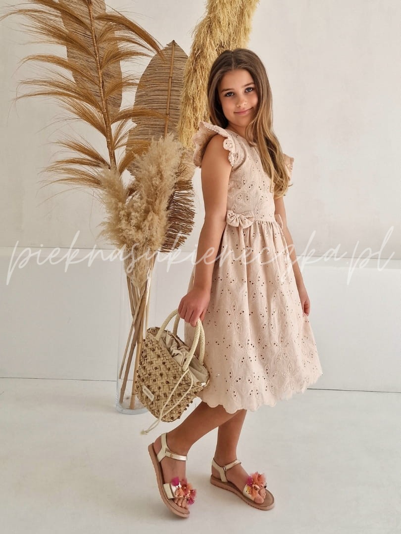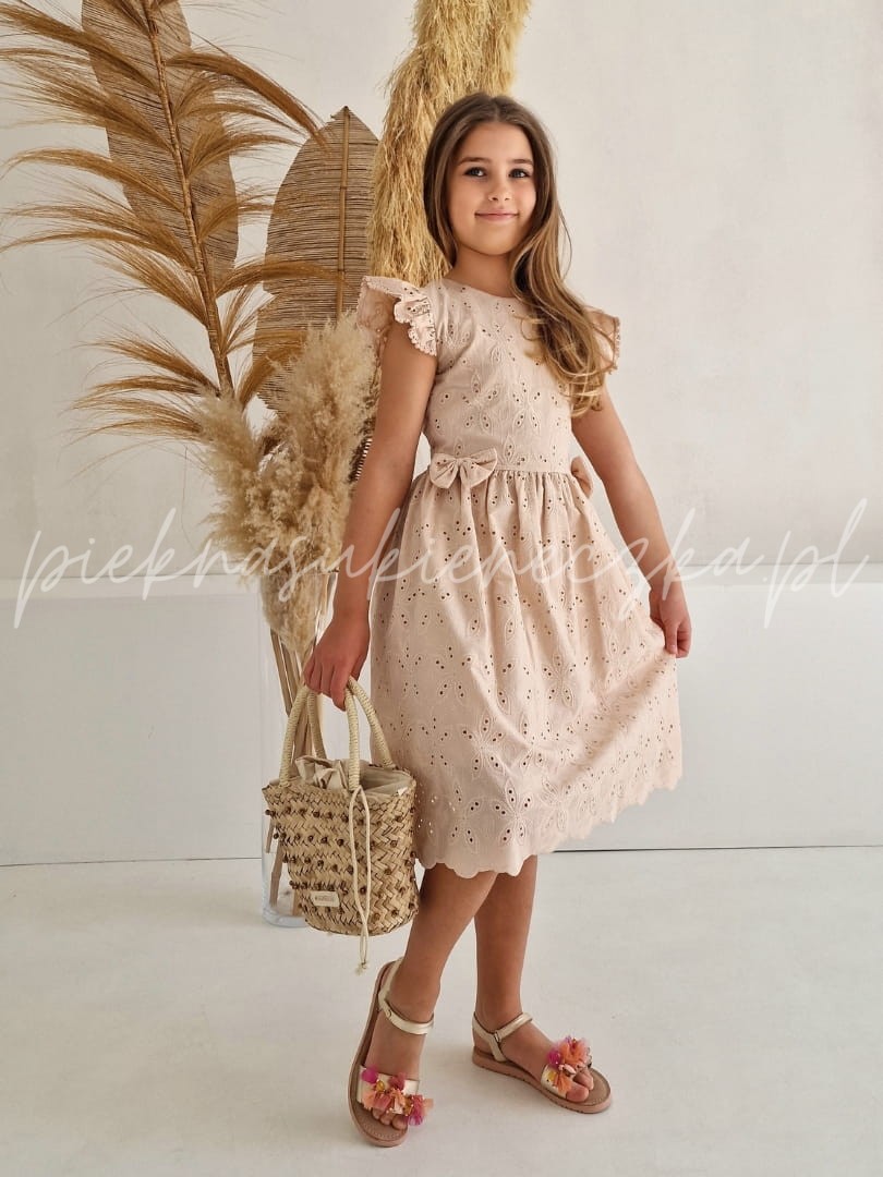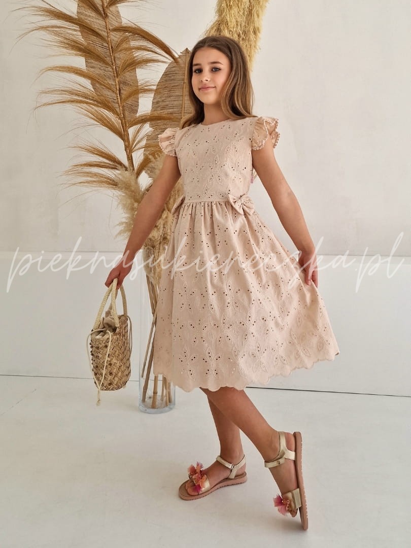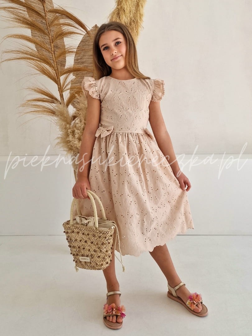 Arlena- beżowa sukienka ażurowa z kokardkami