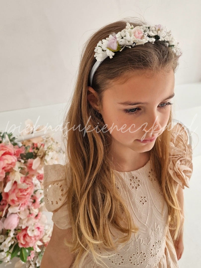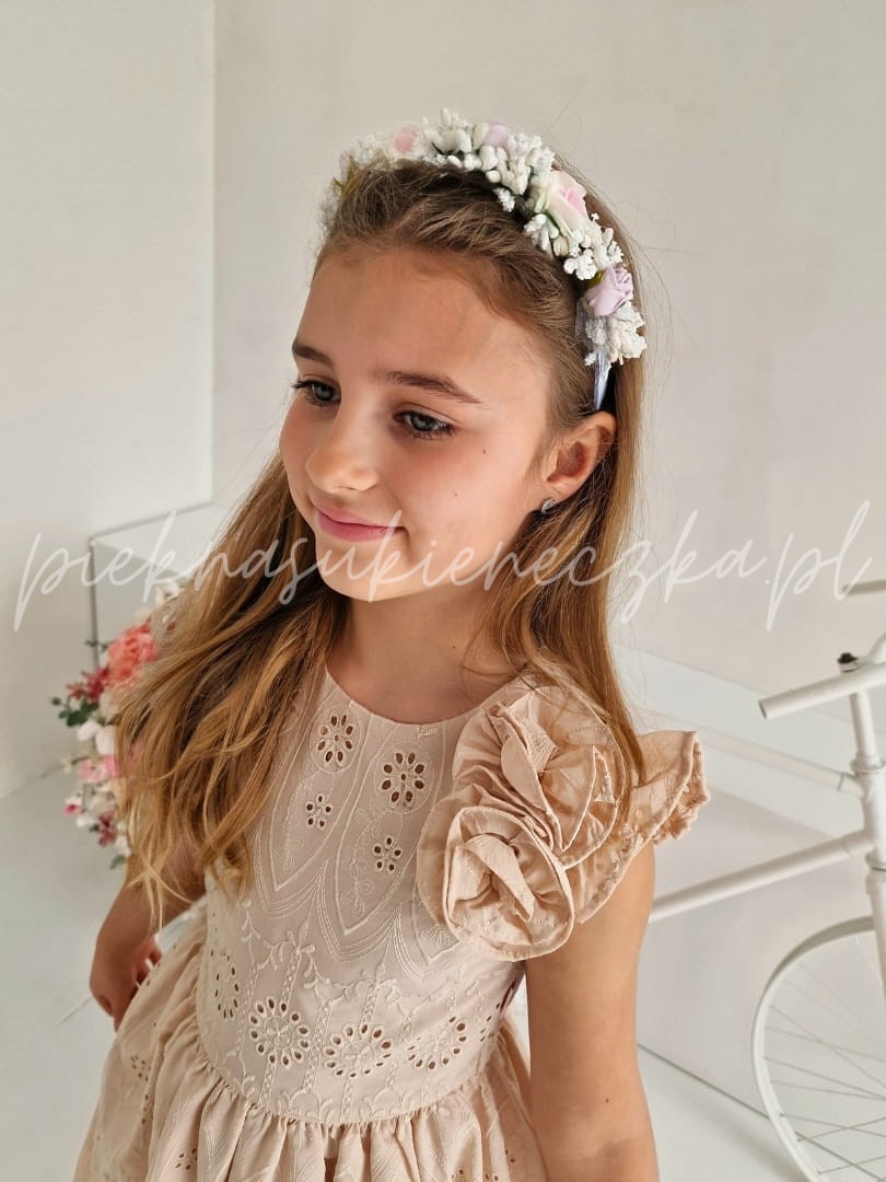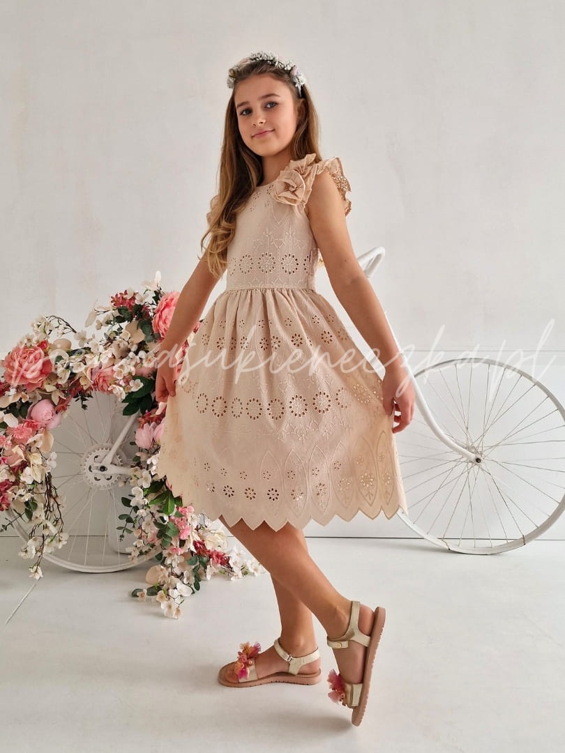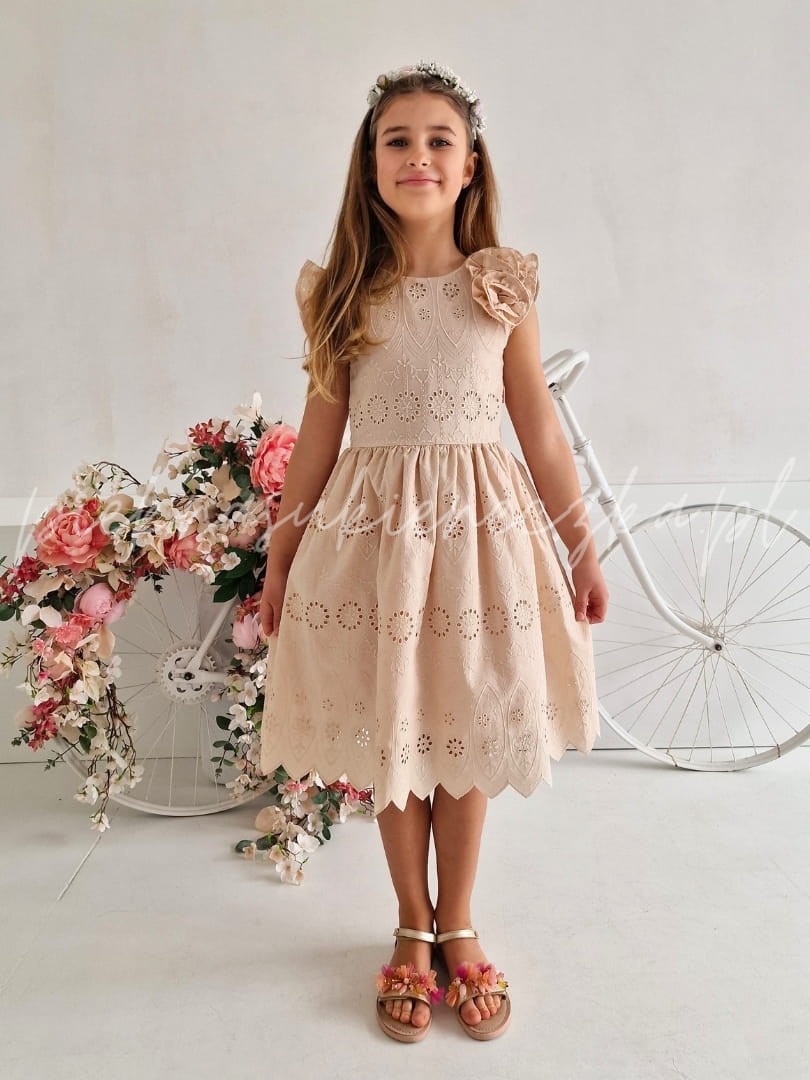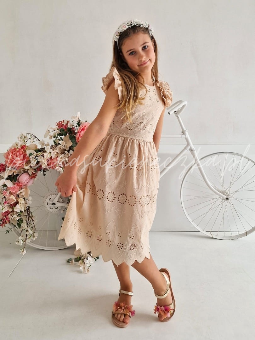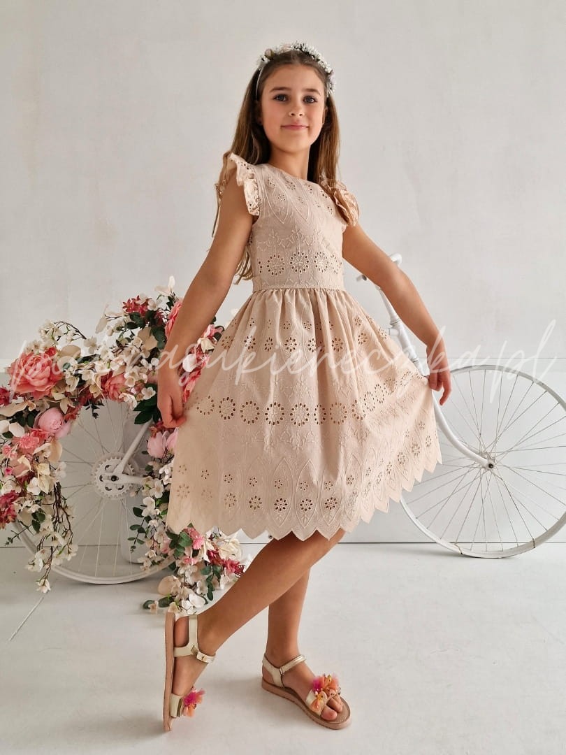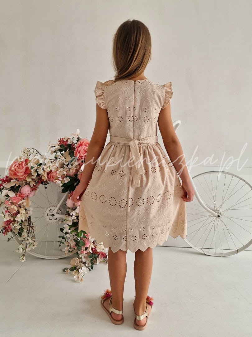 Lucetta- beżowa sukienka ażurowa z motylkowym rękawkiem