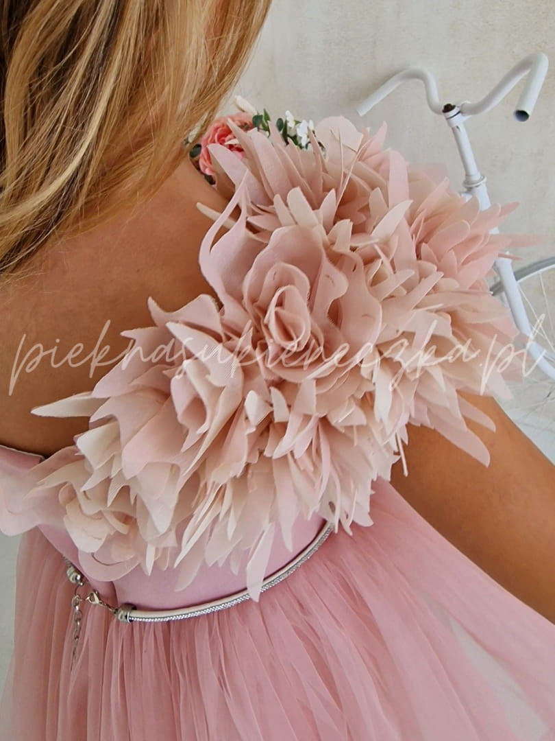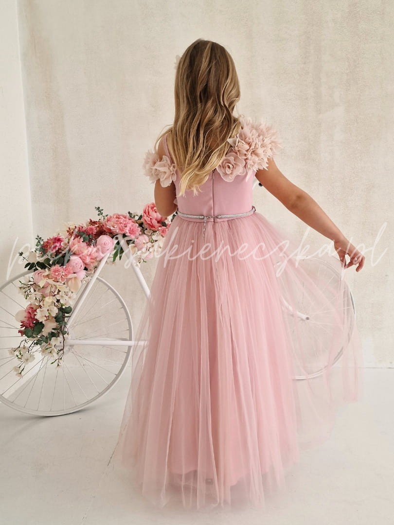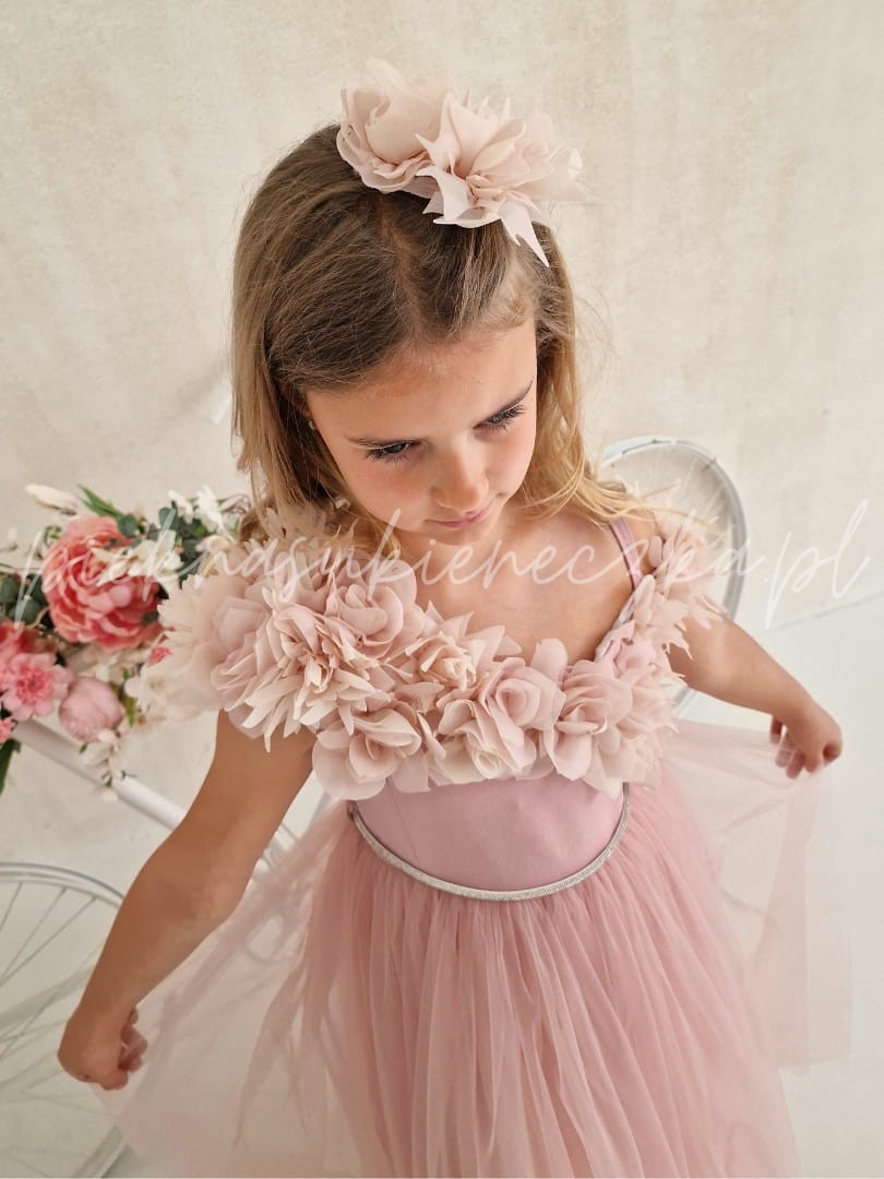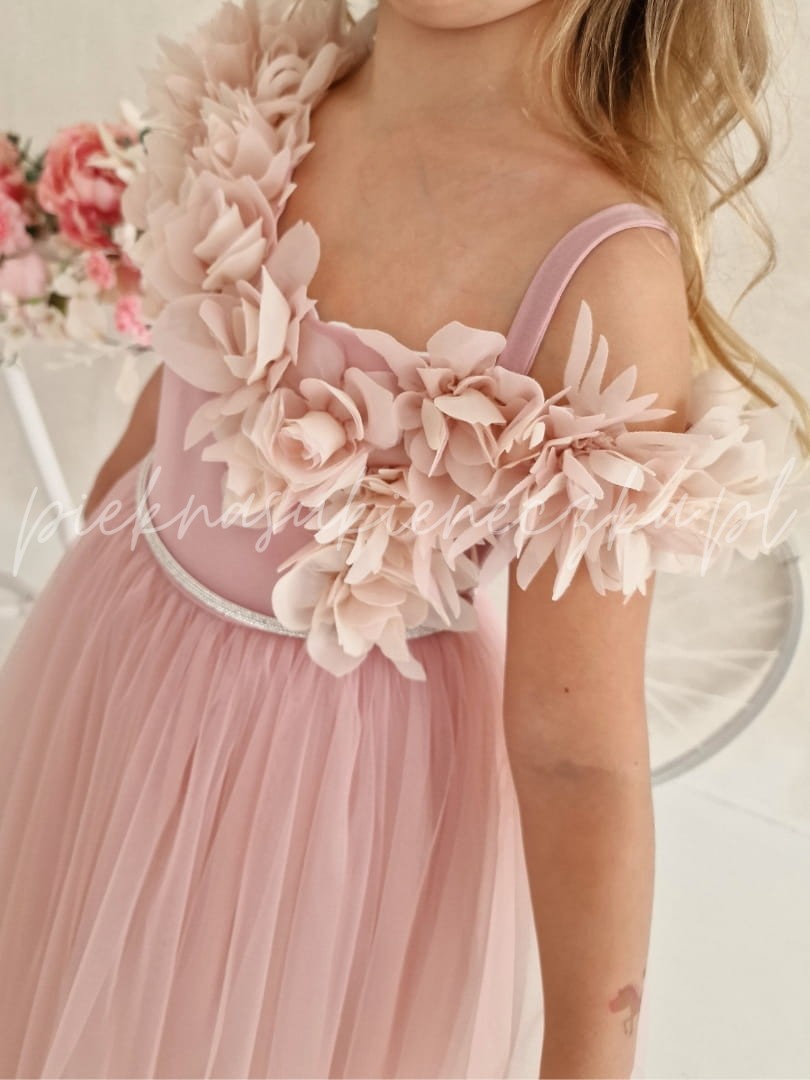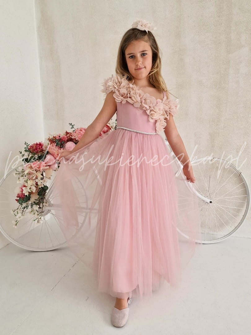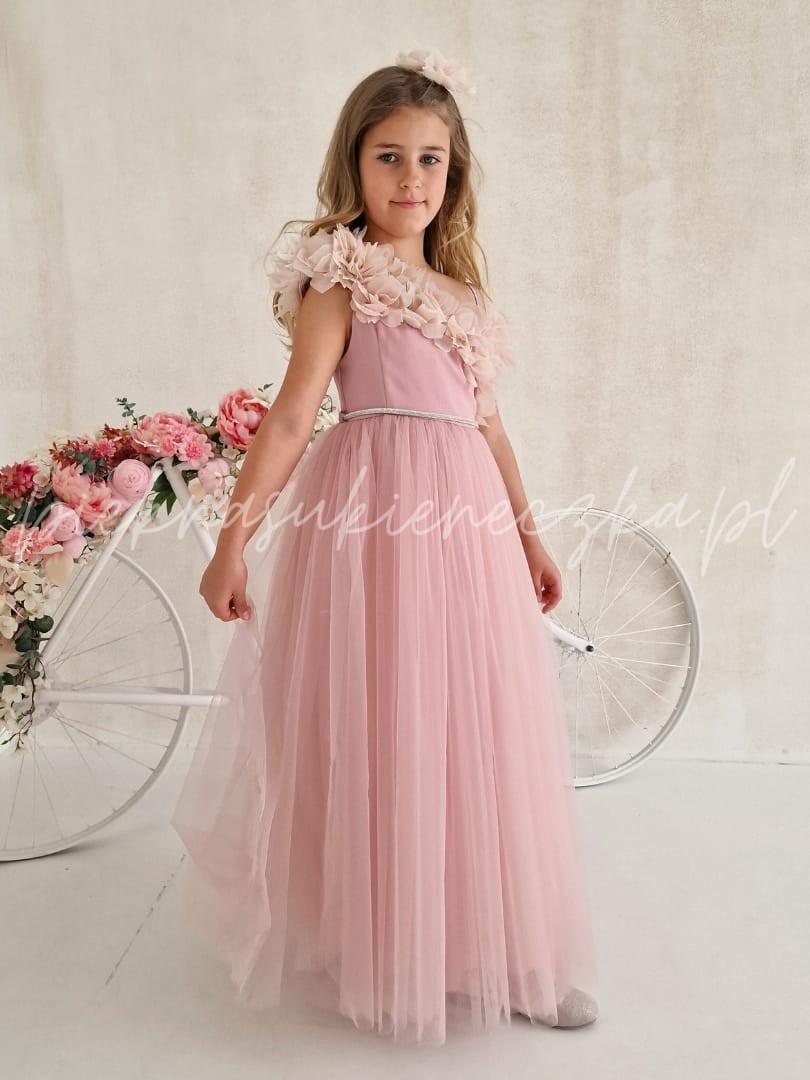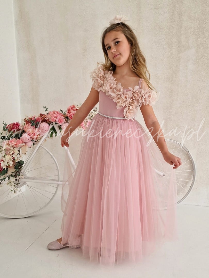W pastelowym różu sukienki Parla kryje się magia, która sprawia, że każda dziewczynka czuje się jak bohaterka własnej baśni. Delikatne kwiaty 3D opadające na asymetryczną górę tworzą niepowtarzalny efekt, a lekki tiulowy dół dodaje sukience miękkiego, eterycznego ruchu. To kreacja, która wyróżnia się na tle innych – pełna uroku, elegancji i dziecięcej fantazji.
