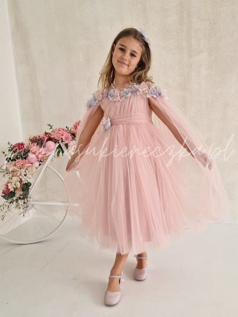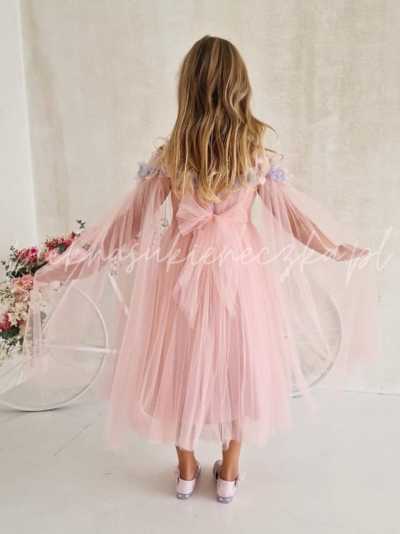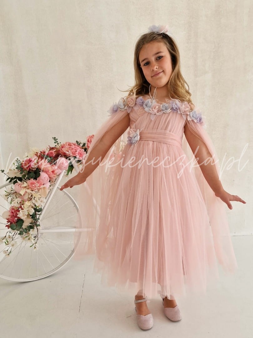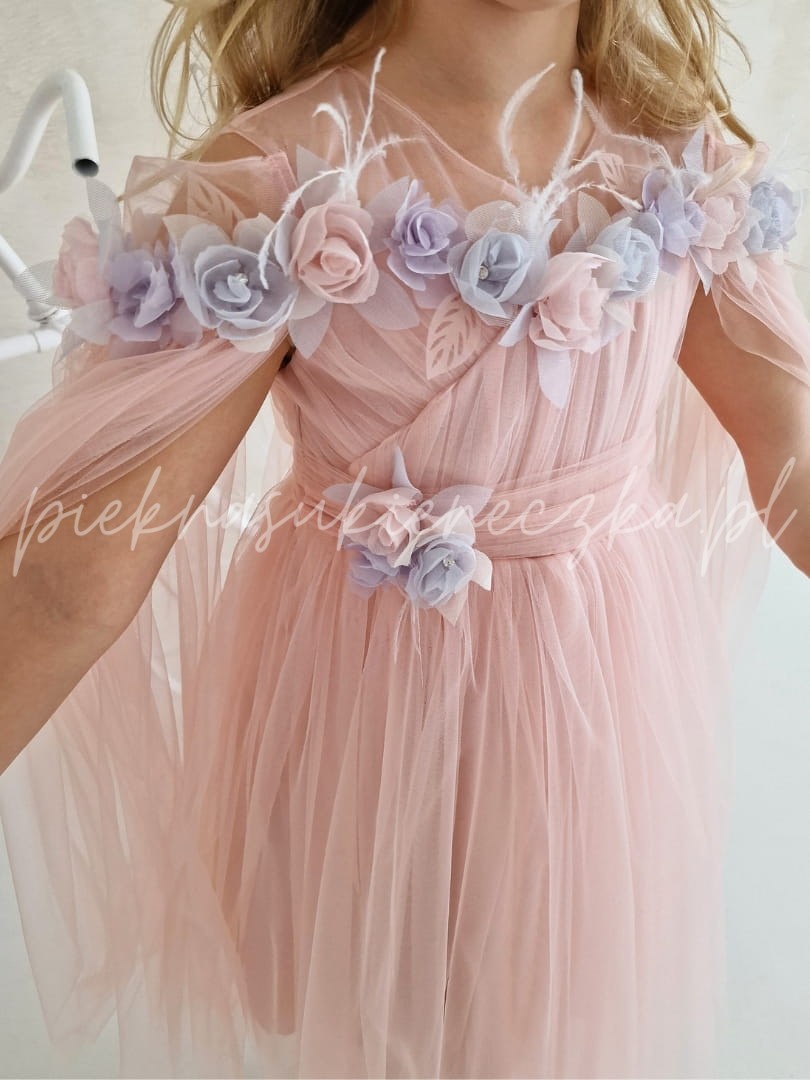 Arleta -różowa sukienka z opadającym tiulem na ramiona przyozdobiona kolorowymi kwiatami